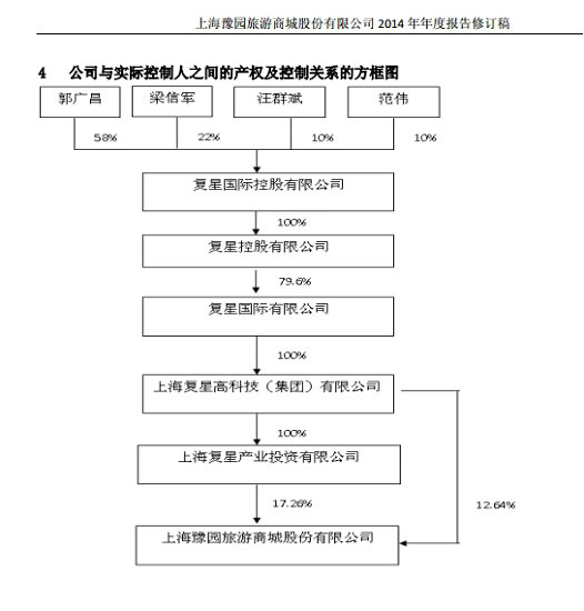 豫園商城年三季報(bào)顯示,截止2015年9月30日,上海復(fù)星高科技(集團(tuán))有限公司直接持有公司9.21%股份,通過上海復(fù)星產(chǎn)業(yè)投資有限公司持有公司17.24%股份,合計(jì)持有公司26.45%股份。上海復(fù)星高科技(集團(tuán))有限公司、上海復(fù)星產(chǎn)業(yè)投資有限公司為一致行動(dòng)人。公司2014年年報(bào)顯示,公司實(shí)際控制人為郭廣昌。