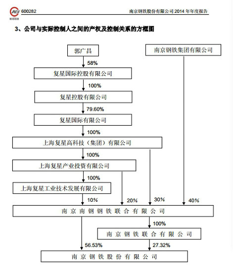 南鋼股份(600282.SH)三季報(bào)顯示,南京南鋼鋼鐵聯(lián)合有限公司持有公司46.32%的股份,為公司第一大股東。同樣,公司2014年年報(bào)顯示,公司的實(shí)際控制人也為郭廣昌。