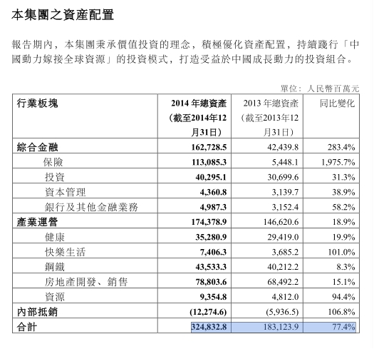 復(fù)星國際2014年年報(bào)顯示,公司業(yè)務(wù)主要分為綜合金融和產(chǎn)業(yè)運(yùn)營,其中綜合金融為保險(xiǎn)、投資、資本管理、銀行及其他金融業(yè)務(wù),產(chǎn)業(yè)運(yùn)營主要為健康、快樂生活、鋼鐵、房地產(chǎn)、資源。