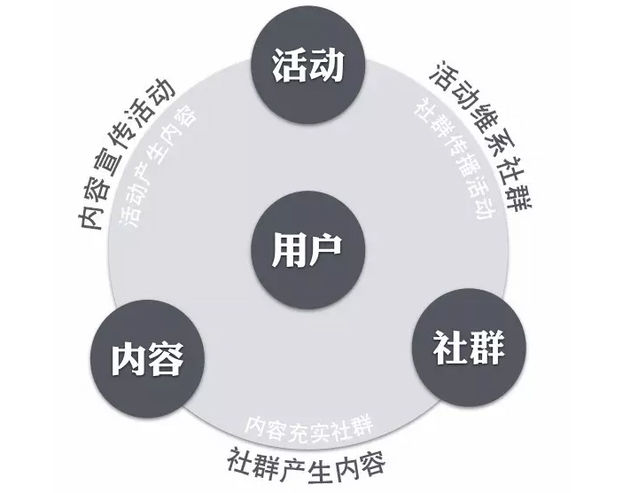 做運營做到一定階段,我發(fā)現(xiàn)各種運營其實是相輔相成的,融會貫通就能夠達到1+1+13的效果。比如下面這張圖,是我總結(jié)內(nèi)容、活動、社群的關(guān)系。而這各種運營工作的核心都是用戶,基礎(chǔ)都是產(chǎn)品。