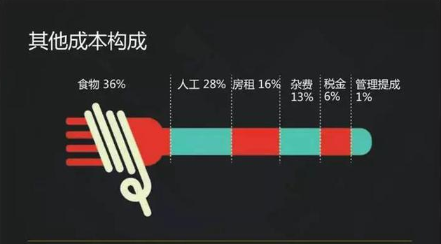我們看食材成本是多少?國外或者同類型的西餐廳一般的成本是占 15% 到 40%,因為我舉例這家餐廳,也是一家意大利西餐廳,食材占 36%。36% 的食材成本,再加上 6% 的雜項稅,看上去好像還有很多的收入。但是你忘了人工成本。人工成本在整個營收當中占比 28%,加上雜費 13%,加上稅金 6%,包括 1% 的管理提成。剩下還會有多少?