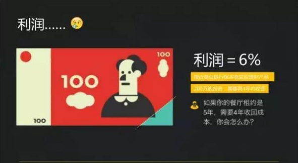 剩下的利潤僅為 6%。可能有些朋友會說,6% 的利潤還不錯,至少你的餐廳不虧,至少有盈利。但是大家想過沒有,如果七百萬的資金投入餐飲按 5 年算,如果每年只有 6% 的投資收益,那我完全可以用非常文件的投資組合來完成。