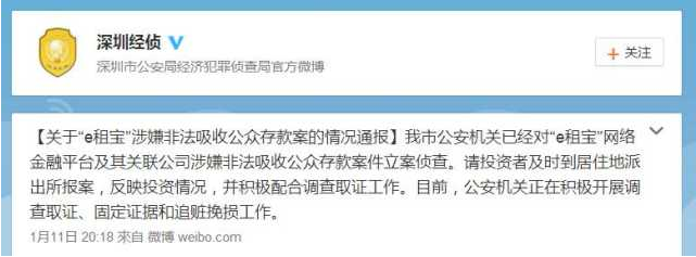 深圳市公安局經(jīng)濟犯罪偵查局官方微博發(fā)布消息稱:深圳公安機關已經(jīng)對e租寶網(wǎng)絡金融平臺及其關聯(lián)公司涉嫌非法吸收公眾存款案件立案偵查。這也是繼e租寶正式被立案偵查后,第一次被明確定性為“涉嫌非法集資”。