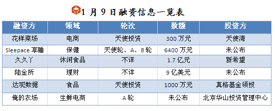1月9日收錄了6條融資信息:花樣菜場、Sleepace享睡、久久丫、.陸金所、達(dá)觀數(shù)據(jù)、俺的農(nóng)場。 1.在線購菜平臺『花樣菜場』獲天使灣300萬元天使投資 花樣菜場聯(lián)合創(chuàng)始人兼COO王永智
