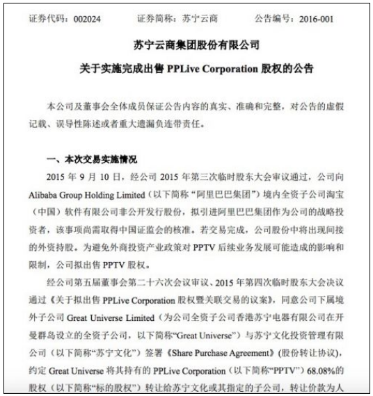 1月5日消息,蘇寧云商日前發(fā)布公告,截止2015年12月31日,所持PPTV股權已全部轉(zhuǎn)讓給蘇寧文化,實施完成本次交易。 蘇寧云商稱,同意公司下屬境外子公司Great Universe Lim
