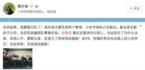 史玉柱宣布回歸巨人網(wǎng)絡的同時,離開小米430的,小米科技聯(lián)合創(chuàng)始人、高級副總裁黎萬強也宣布重新回歸小米,負責小米市場部及小米影業(yè)。 1月4日晚上7點11分,黎萬強在新浪微博上宣布了自己最新的狀
