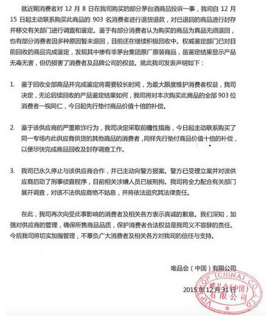 1月4日消息,在2015年最后一天,在美上市公司唯品會發(fā)表聲明,確認部分消費者在平臺購買到假茅臺。唯品會表示,公司已經(jīng)停止與該供應商合作,并已主動向警方報案,涉嫌人員已被刑拘。唯品會對已退回的商品