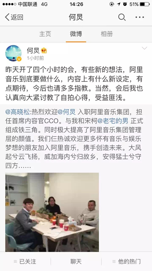 12月28日,著名電視主持人何炅入職阿里音樂并擔任首席內(nèi)容官CCO,花名“小炅”,直屬主管為宋柯。 消息發(fā)布之后,宋柯與高曉松均在朋友圈表示歡迎。高曉松發(fā)微博歡迎何炅加入阿里音樂,并稱自己與宋
